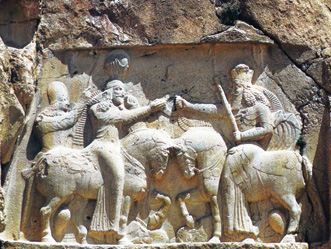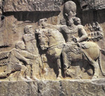 到了公元2世纪,波斯诸侯阿尔达希尔夺取王位,开始了长达四个世纪的统治,史称萨珊王朝。他的儿子沙普尔一世多次在边界打败了罗马帝国的军队。公元259年左右,他在埃德萨附近再次取得大捷,遂学习几百年前的大流士,命人在纳格什—鲁斯塔姆大流士一世崖墓的下方刻制了一块大浮雕,描绘两位罗马皇帝向骑在马上的沙普尔一世致敬,其中一个还屈着膝(图2-056)。因为,沙普尔一世不仅击败了约7万人的罗马军团,还活捉了罗马皇帝瓦莱里安。浮雕中,沙普尔一世还抓住另一位罗马统治者(可能是阿拉伯人腓力)的手腕。这块浮雕的位置选择,可能是出于沙普尔一世以伟大君主大流士一世的继承人自诩,也考虑到在行人众多的驿道旁边,更便于宣扬他的战功(图2-057、图2-058)。