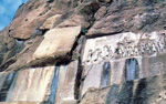 在波斯西部的扎格罗斯山脉,从埃克巴坦那到基尔曼沙赫的驿道旁的一处峭壁上,刻着一幅浮雕,纪实性地描述了大流士一世战胜10个叛乱国王的场景。他带着随从,一脚踩踏在一个投降者的背上,面对着另外9位被捆绑的君主。在这些人物雕刻的下方,用三种文字(古波斯语、巴比伦的阿卡德语和埃兰语)宣称了他平定叛乱的胜利,向往来于驿道的行人宣扬君主的权威(图2-053、图2-054)。