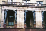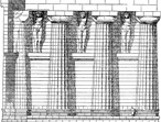 西西里岛西海岸的阿格里真托城,于公元前480年,为庆祝对抗迦太基人的胜利而兴建了一座规模十分宏大的陶立安式神庙——宙斯神庙。整座建筑长110米,宽53米,其内殿是希腊最大的。由于规模庞大,它采用了嵌入外墙的半露柱,柱高约20米,直径约4米。由于柱间距离几近9米(柱中轴线间距),柱顶过梁(额枋)未用整条石材,而采用方石砌筑,因此在柱间加了镶入上部墙壁的支撑柱,以承担较小尺度的方石。令人惊叹的是,这些支撑柱被雕刻成了高达8米的巨人提坦的雕像(图3-015)。用双臂高举、充满力度的男性雕像来支撑巨大的建筑构件,在视觉上确是顺理成章的。而且从建筑外观上看,墙面上出现具象的人物圆雕矗立在巨大半圆柱之间的上部,也别具风致。在以后的古典主义和巴洛克建筑中,这种男像柱也是常常被运用的。一个著名的实例是18世纪圣彼得堡的冬宫,其侧立面就有一圈男像柱的门廊,姿态与它完全相同(图3-016)。