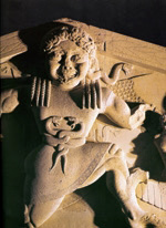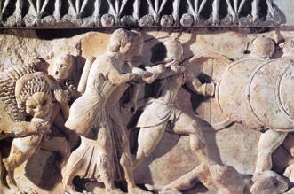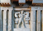在远离希腊半岛的意大利南部的西西里岛上,舍利诺斯的C神殿也是同时期的略晚作品。陇间壁的装饰浮雕《帕尔修斯追杀美杜莎》和《赫格里斯肩挑两侏儒》(图3-011)都呈现出古风时期僵硬古板的艺术风格,而且在构图的安排上也显得力不从心。