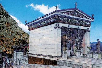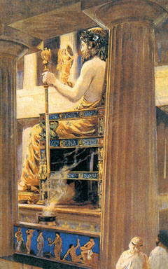 建于公元前470~前456年间的奥林比亚宙斯神庙是全希腊的神圣殿堂,整个伯罗奔尼撒最大的神庙,奥林比亚广大建筑群的中心(图3-017),现已完全被毁。它的装饰雕塑已经摆脱了古风时期和古典初期在建筑中的完全从属性质,在服从建筑全局框架的前提下,赋予雕塑更强的独立意义。后来,也是在这座神庙中,菲迪亚斯安放了他创作的伟大的宙斯巨像(图3-018)。从整座神庙的雕塑布局来看,东山墙作为第一重点,部署了希腊神话中珀罗普斯与俄诺玛俄斯国王赛车的故事。这个主题正与神庙作为奥林比亚体育竞赛中心的功能相呼应。西山墙的群像则表现希腊人(勒比底人)与半人半马的山陀儿的战斗,寓意着人性的胜利(图3-019)。与当时大多数神庙一样,宙斯神庙外部檐壁上并没有装饰雕塑,却在外部的列柱后面的檐壁上安放了浮雕,以赫格里斯的英雄业绩为题材的系列作品。(由于这个位置采光不好,可观看的视角也受到很多阻碍,观看效果并不好。)借助神话故事讴歌人和英雄的力量,用这种象征手法表现当时社会的理想和道德,成了古典盛期雕塑和建筑的共同主题。