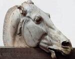 虽然有菲迪亚斯的严格监督和指导,但众多雕塑家的水平和风格毕竟是不同的。巴特农神庙两面山墙上的圆雕群像无疑是精品,但西山墙上一个马头的体量与所安置的空间尺寸没有计算精确,以至不得不把马头和下颚,从背面砍去大块石料(图3-022)。一尊赫斯提女神也是类似的情况,被切掉了一部分。内殿外墙檐壁上的游行队列浮雕是极为出色的,但采光不好,观赏条件也不理想。而神庙外墙陇间壁的方形高浮雕则是水平参差不齐。有的动态舒展、力度饱满、形体结构准确自然;有的却动作僵硬呆板,比例不准。这可能是因为雕刻工作量大,工期又较紧,优秀雕塑家人手不够,有的作品带有匆忙赶工的痕迹,使菲迪亚斯也有力所不逮之处。