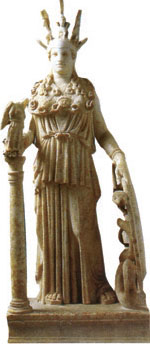首先,这件雕像作为整个卫城的第一号作品,它应能概括地、全面地表现雅典保护神的身份和地位,必须是综合的、神圣的、纪念性最强的。它的动态、构图和形象应突出庄严和权威。所以,菲迪亚斯设计它的动态,基本是正面站立,不作旋转和扭曲,只有左腿略微弯曲,姿态稳重中有稍许妩媚。服饰上,不穿甲胄战袍,仍着无袖长衣;头盔华丽,但非战士的头盔,有斯芬克司和克利芬的形象,说明女神并不是处在厮杀中的战斗状态。盾牌和长矛当然是守护神的必需装备,又使构图增添了圆弧和直线的轮廓。胸饰是美杜莎。从身后盘旋到侧面,昂首吐信的巨蟒和胸前的盘蛇装饰,以浓烈的神话色彩赋予它崇高的权威性。右手托着胜利女神小像,更显示了在它佑护下的胜利前景。这不像广场上的那尊雅典娜,仅仅是一尊战神,这是一位统帅,一位名副其实的守护神,已具备了王者之气。安放在神庙主殿中的主神就应该是这种形象,它不是怒目圆睁的凶神恶煞,而是英武中散发着典雅气质,静穆而富有活力。雅典子民们怎能不倾倒在他们的神灵面前呢?