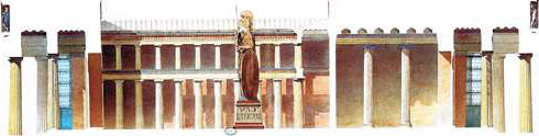 我们可以想象一下,此时出现在人们眼前的是:耸立的雅典娜铜像居中略偏左,其左后方是造型错落的伊瑞克先翁神庙,右后方则是巴特农神庙西北侧的壮丽身影,恰好构成一幅富有变化而又均衡的精彩画面。其中,巴特农神庙的巨大体型和绚丽色彩,极有层次的光影节奏,无疑使它占有突出的位置,显示了它在整体环境中不可撼动的地位。雅典娜铜像虽然体量不是特别大,但由于位置靠前,而且居中,色彩深重,又是高耸的具象形体,能牢牢控制着第一景观,揭示环境的主题。而轮廓富有变化的伊瑞克先翁神庙,由于体量较小而且位置较远,自然退居次要,作为补充。这种仿佛于不经意之中,实则经过精心构筑而达到预想的完美艺术效果的手法,在以后两千多年中的欧洲还未曾见到过。