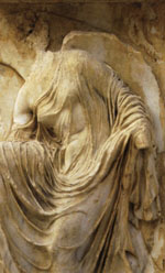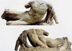 有意思的是,以前的雕塑家很少花时间去把山墙上的雕像背面刻完整,因为站在地面上的观众不可能看到这些雕像的背面。而巴特农神庙的山墙雕像是完完全全的圆雕,背面也刻得很完整(图3-021)。正因为这些作品完全是圆雕,背景墙面又是涂成蓝色的,因此雕像的轮廓和明暗对比是十分强烈的,给人的印象更加深刻。