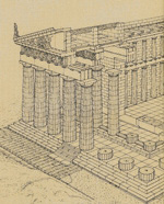 当行进队伍走到巴特农神庙东侧,也就是神庙的主入口处,便在那里举行活动。东升的阳光正照耀在巴特农神庙的主立面上。东山墙上的雕像中,智慧女神雅典娜从宙斯的头颅里奇迹般诞生的神话场景,形象地出现在公众面前。洁白的大理石建筑上的红色、蓝色、金色的装饰使雕塑更显高贵。群众进入巴特农神庙,瞻仰高达12米的雅典娜神像,无疑是活动的最高潮。巴特农神庙的宽度在比例上比奥林比亚的宙斯神庙有所增加,更易容纳巨大的雅典娜雕像(图3-026)。