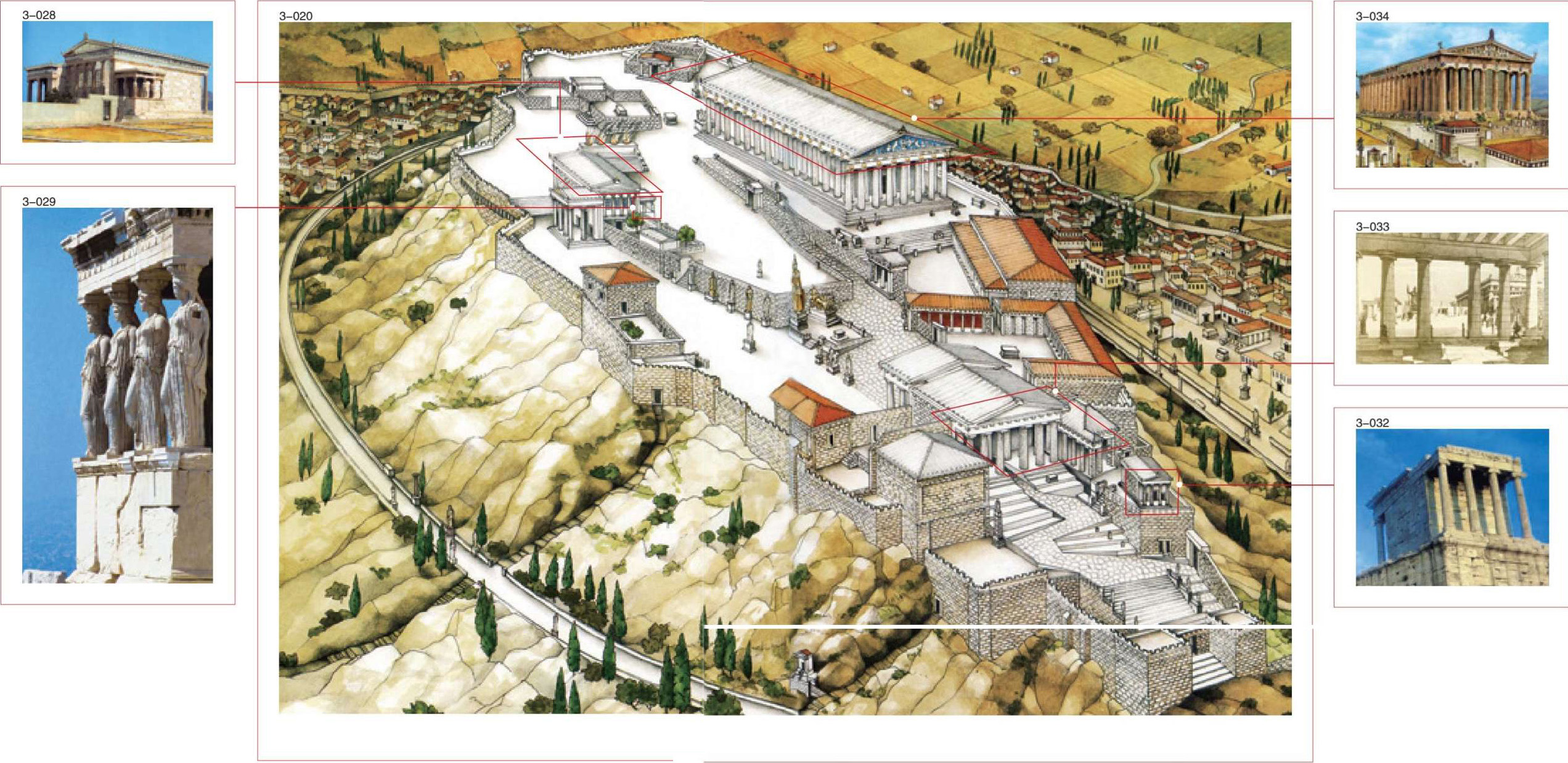 卫城所在的阿克罗波利斯山(意为“圣城”),是神话故事中雅典娜和她叔叔海神波塞冬的争战之地。这里在很早时候就建造过一些神庙。公元前8世纪,山顶上出现了第一座雅典娜神庙。从公元前566年开始,每当泛雅典娜节日,雅典的少女们便以整个国家的名义向雅典娜女神奉献她们所织的无袖外衣。但是在后来的战争中,神庙被波斯人破坏殆尽。为了庆祝对波斯战争的胜利,鼓舞人们热爱雅典的激情和提供就业机会,伯里克利促成了卫城的重建。他雇用当时最优秀的建筑师,并指派菲迪亚斯全面负责工程建设。从公元前449年开始,到公元前406年竣工,终于完成了这座精美绝伦的雕塑与建筑的纪念性综合体(图3-020)。