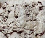 而此时,在行进队伍的右侧,可看到巴特农神庙内殿外墙的檐壁上,长达160米的浅浮雕,有趣的是,它所表现的内容,正是泛雅典娜节朝圣的游行队伍(图3-036~图3-038)。游行的人们所看到的浮雕中的队列与自己行进的方向保持一致,显得很顺畅。浮雕中的这支队伍,或步行、或骑马、或驾车,有坐有立,有的提着装礼物的篮子,有的带着供献的祭品,动作变化丰富,毫无雷同,节奏分明。虽有远近层次,但仍很好地保持了墙面的建筑感,有极高的艺术水平,属于古希腊最出色的浮雕作品之列。它与古埃及浮雕强调装饰性的单摆并列的手法不同,作品趋向于生活化的处理,不仅细部刻画准确写实,动态结构都表现了生活的真实感,且厚薄的压缩、浮雕语言的运用极为纯熟。但是,这一长卷式的浮雕精品所安排的位置是不合理的:首先,它不适合远处观看,必须到近处或进入柱廊才能仰望;其次,它没有很好的光照,加之本身是起伏不太大的浅浮雕,所以无法充分展示这件伟大作品的表现力,而仅仅起到了对建筑的装饰作用。这实在是很遗憾的,也许是古希腊艺术家千虑之一失吧。屋顶坍塌以后,残存的浮雕受到天光的照射,效果倒很好。