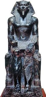 在开罗近郊的吉萨高原,继公元前2560年第四王朝第二位君主——胡夫法老建造了规模空前的大金字塔之后,他的继承人哈弗拉,紧挨着它建造了第二座高达143米的金字塔。令人震惊的是,在这座金字塔的正东约600米处,紧靠尼罗河的下庙旁,建造了一尊无比壮观的圆雕,一个奇异神秘的怪兽——狮身人面像(图1-004~图1-006)。这是人类第一次为一座伟大的建筑物,创造了一件伟大的圆雕作品。它把一个人的头部,包括国王的王冠头饰和假胡须,安放在一头雄狮的身躯上。这样大胆而极富想象的构思和实践似乎是突然出现的,目前尚未发现小规模试验的迹象。这一起步真是出手不凡。在缺乏过渡和准备的情况下,能把握整体的姿态和体量、形体和特征,达到如此的高度,的确令人叹为观止。一般认为,这座大狮身人面像是用建造金字塔时采石场上残留的岩石雕刻而成。这块石料用于刻制这么一个庞然大物(高19.8米,长73.2米),似乎还不够大。因此,它的前爪和臀部都是另用石块补砌而成的。至于它的功能,则被认为是陵墓的守护神。一位美国的埃及学家认为,它象征着哈弗拉法老转化为荷鲁斯(埃及君主神,也是鹰神),负责向太阳神——瑞进献祭品。正是在哈弗拉统治时期,埃及人转为信奉东方的太阳神,它主司日出日落,每年有两次,春分和秋分,太阳垂直地沿着它的头部升降。一种更为直观的意见认为,它是根据哈弗拉法老的面容刻制的。拿现存开罗博物馆的,公元前2550年的哈弗拉法老雕像(1860年从哈弗拉金字塔前下庙发现的)作一比较,显然是可靠的(图1-007)。这已由美国的埃及学家马克·莱赫纳尔通过电脑测绘而加以验证。将金字塔中埋葬的已故法老的头部与雄狮的身躯相结合,这是极富创造性的构思。用这种手法将君主和神祇合为一体,极大地强调了统治者的智慧、力量和永恒。后来,在新王国第二十六王朝时,人们找到了刻在石头上的自白:我保护你的陵墓,你的祠堂/我守卫你的大门/我将挡住入侵的外人,击退仇敌/我将把你的对手消灭在他们潜在的地方/使他们不得复出。