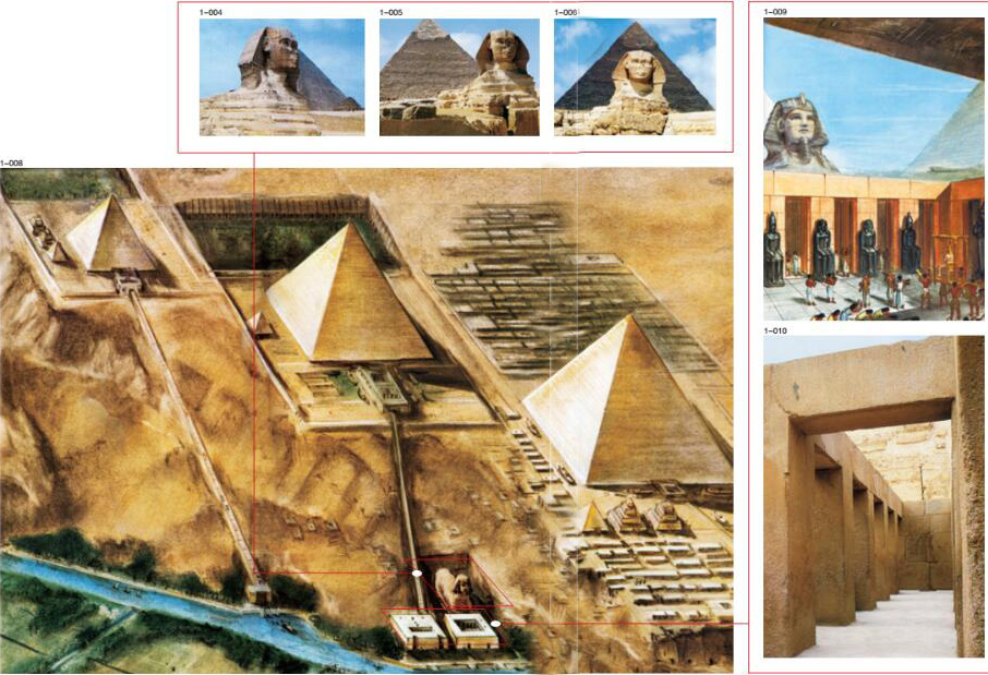 这尊硕大的巨兽朝向东方,紧贴尼罗河,每天最早迎接阳光。这里的地势要比金字塔处低约30米(图1-008)。尼罗河是古埃及最繁忙的交通线,各地来朝觐金字塔的人们乘坐航船来到码头,一上岸首先看到这宏大壮观的神秘形象。视距上的差别,缩小了它与金字塔尺度上的反差。怪兽的具体形象和变化的形体组合在单纯简洁的金字塔角锥几何形背景前突现出来。人们分成两组从东侧的双门进入下庙,集合在庙内一个很宽的门厅内。从室外到室内,空间一下子收缩了。然后,进入下庙的主体部分,T字形的多柱大厅,紧靠大厅墙面是很多已故法老的雕像,共有23尊,由大厅顶部裂缝的昏暗光线所照射(图1-009、图1-010)。这里也是加工已故法老木乃伊的圣地。人们完全进入了一个冥界。队伍从T字形大厅的西北角,进入下庙长约600米的昏暗甬道。待到钻出甬道已至金字塔脚下,供祭祀的上庙院落。通过甬道进入上庙两个有窄道相连的入口部分,即来到一个由柱廊相围的露天院落,列柱前有已故法老的雕像,共12尊。人们在面前的5间小室摆放祭品,为国王举行殡葬仪式,又有窄道可通往金字塔的墓道。仰首看去,突然呈现的是无边的、望不到顶的伟大石山。对笃信宗教神力的人们,心理上的震撼是可想而知的。这种从具象到抽象,从开放到封闭,再到开放的空间序列,创造出惊人的艺术效果,应该是经过周密设计的。