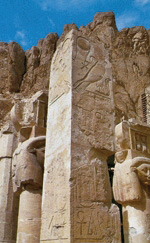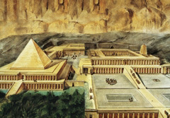 古王国时期金字塔陵墓的兴建延续了五百年,进入中王国(公元前22世纪)时期后,迁都底比斯,主要的建筑工程便转为在这个多山地区建造崖墓和神庙建筑。第十一王朝的法老门图霍特普二世建于达尔·埃尔·巴赫里的,陵墓与祭庙合一的陵庙(图1-014),把一个小型金字塔安置于两层柱廊之上,形成宏伟、新颖的构图。它所选择的环境是在金字塔形山体的残崖断壁之下,另有甬道通向山体内的墓室。墓借山势,浑然一体,开创了古代埃及建筑史上一个新的篇章。可惜,现已全为废墟,其中雕塑共有多少,又是如何安排,都已被尘封,成为谜团。