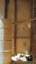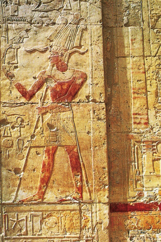 女王陵庙的雕刻装饰也是十分富丽的。第二层柱廊的26根柱体前面都雕有一尊女王形象的奥西里斯冥神的圆雕。柱廊内则有浅浮雕和壁画(图1-017、图1-018),除了有哈托尔女神、阿努比斯神、长着公羊角的克纽姆神的神话故事外,还有反映当时社会生活的景象,如埃及与东非的贸易场面。此外还出现了长着一双牛耳的哈托尔女神头像的柱头(图1-019)。这是在公元前15世纪,可想而知神庙的富丽堂皇。她的执政给埃及带来22年的和平繁荣,并且完成了一些非常精美的标志性建筑,但到了她的养子,也是她的亲女婿图特摩西斯三世执政后,她的陵庙被毁,雕像大部被毁。各建筑物上女王的名号被刮除,改为图特摩西斯三世自己的名字。在新王国时代的王名表中也不列出哈特舍普苏女王的名字。这可能是因为图特摩西斯三世虽然在12岁就继承了王位,却被女王掌控了政权,心中耿耿于怀,不愿承认哈特舍普苏称王的事实。所以,现在已经看不到有多少雕塑作品在这座无与伦比的雄奇建筑中的作用。