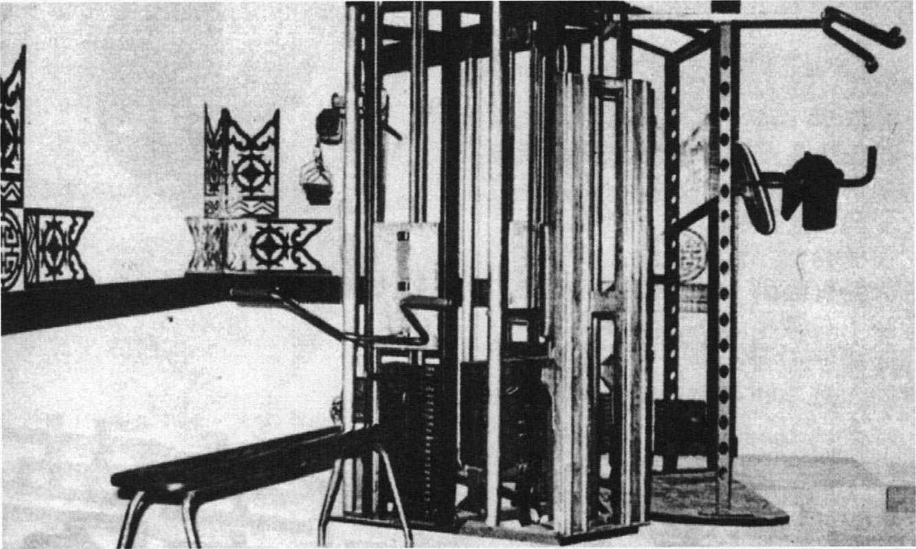 腿部推蹬器特别引人注目:在许多方面,它可以说是今天诺迪克训练设备(Nordic Trac)的前驱。推蹬器的底部延伸出两条轨道,每条轨道上装着一个脚镫,样子很像今天大多数赛跑运动员在起跑线上使用的起跑架。这两个脚镫连接着两组配重块,可以在10~220磅的重量范围内进行调整。
