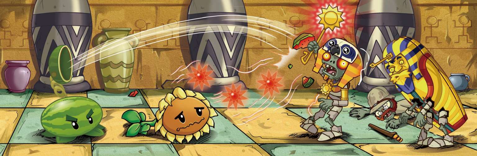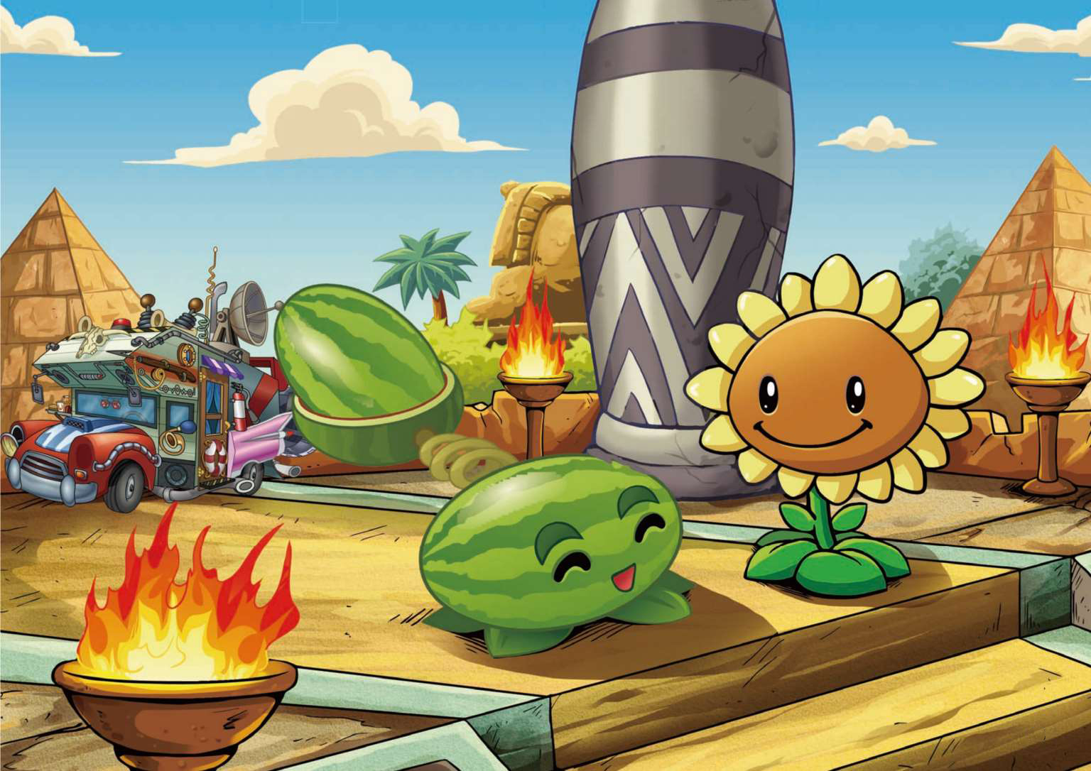 在太阳神僵尸扑上去就要吃掉向日葵的时候,西瓜投手抛出了西瓜炮弹,太阳神僵尸倒下去了。正当西瓜投手欢呼得意的时候,身上背着一个木棺的法老僵尸走了上来,他用他的木棺抵挡着西瓜投手。