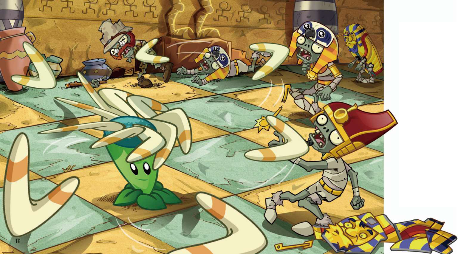 这时候,从石像后面又走出了好几个太阳神僵尸,他们用魔杖吸收着向日葵发出的阳光。没有了阳光,西瓜投手也渐渐倒下了。僵尸们叫喊着,跳跃着,他们自以为绝对胜利了。