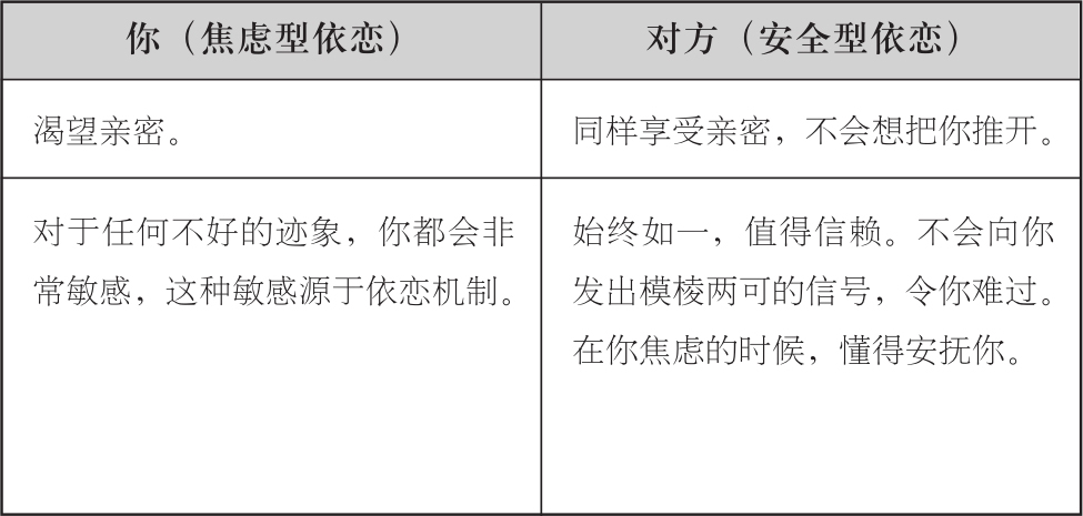 再往深入地理解,我们就会明白:作为一个焦虑型的人,你在遇到安全型伴侣之后,产生的感受是与回避型截然相反的。安全型依恋风格的人,传达出来的信息都是很坦诚、直率并且始终如一的。安全型的人不排斥亲密,也相信自己值得被爱。他们并不需要时时旁敲侧击或不择手段。同时,他们的困惑也会明确表达,不需要通过发脾气和猜疑来表现。因此,就你自己来说,依恋机制会相对比较平和。可是,由于你已经习惯了在爱情中触发依恋机制,而安全型伴侣不会让你有拉响警报的机会,因此你便很难对他们心动。你已经将平静的依恋机制,等同于无趣和冷漠,而正是基于这个谬论,你往往会让完美的伴侣就此流走。