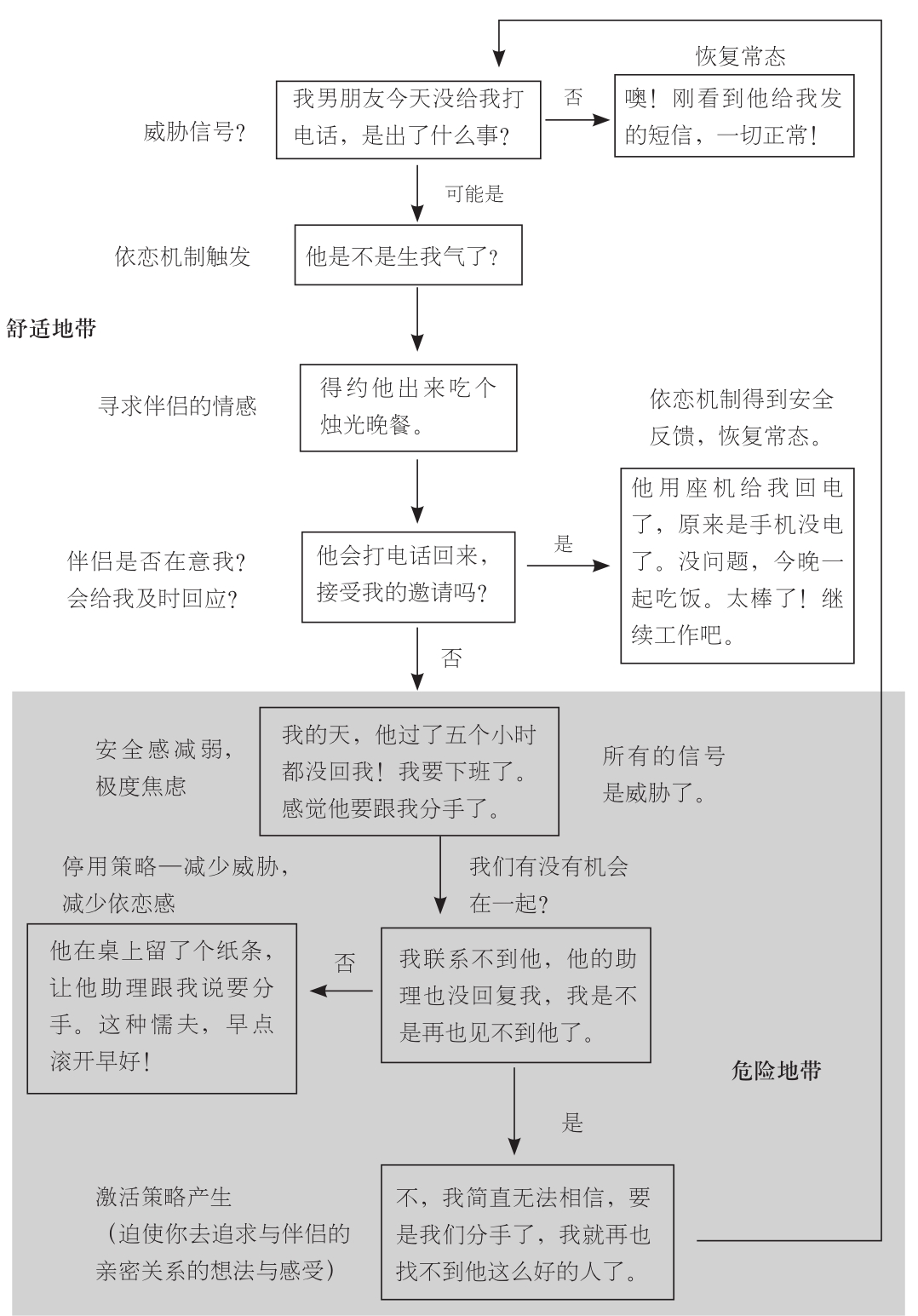 在艾米莉与大卫在一起时,就亲密关系来说,她将自己的生活置于一个“危险地带”。她感觉自己是个丧失防护网的走钢索者,焦虑地苦苦挣扎,试图在经历无限循环的激活状态时,能够保证情感上的平衡,在周而复始的循环之间,仅仅残存着罕见而短暂的安全感,能够算是喘息之机。她的一切想法、感受与行为都被一件事所左右,那就是大卫没空陪她。她对于亲密关系,几乎从未间断地存有威胁感。她总是尽力去消除这种威胁感,通过努力地接近他,来将威胁感最小化——花费诸多宝贵的时间,在网上乔装成其他人,抑或是不断地在接受分析,或者与朋友交谈时提及他。这样一来,她便能无时无刻不将他印在脑海里。所有这些看似古怪的想法和行径——也就是激活策略——都有着共同的目标:就是建立与大卫的亲密关系。若是大卫时刻陪伴着艾米莉,那么这些激活策略便会被扼杀在摇篮里,而并非不断地膨胀直到失控,艾米莉也永远不会脱离亲密关系之中的“舒适地带”。如今艾米莉已经结婚,也不再感觉自己受困于危险地带。她的丈夫忠诚、悉心,最重要的是有空陪她。然而她依旧深谙一点,那就是激活状态下的依恋机制会迸发出强大的强迫性。若是她进入另一段对方并不时刻有空的亲密关系,那么自己多半又会被打回成那个“痴缠的”自己。这种对旧事可能卷土重来的预感,往往令她感到脊背发凉。