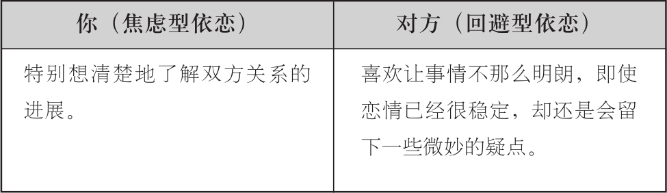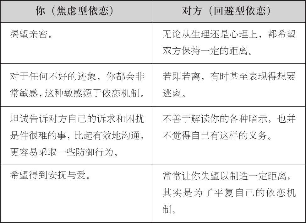 而接下来的一步,就是试着开始表达你的需求。很多焦虑型的人都容易陷入那些畅销书作者,或者说整个社会观念为他们挖下的陷阱。焦虑型的人会感觉自己的需求太过分,从而试着让自己接受伴侣对于保持距离、划清边界的要求,特别是当伴侣属于回避型人格的时候。或许在世俗眼光中,展现出酷酷的、独立的一面更加容易被接受。因此,他们往往会收起自己的诉求,隐藏自己的不满。但事实上,这样做会让焦虑型的人损失惨重,因为表现出自己的需要,是一件一石二鸟的事情。首先,表达需要正是在做真实的自己,而真实的自己才能够感受到真正的幸福与满足感,一个洋溢着幸福与满足的人,才能在伴侣面前展现出最大的魅力。第二点也同样重要,做一个真实的自己,即使发现对方并没有能力满足自己对恋爱关系的诉求,也可以尽早发现,做出决断。毕竟不是每一对伴侣都能够完全合拍,这是再正常不过的事。如果不能合拍,那就放彼此一马,或许双方都能找到让自己从容应对的幸福伴侣。
