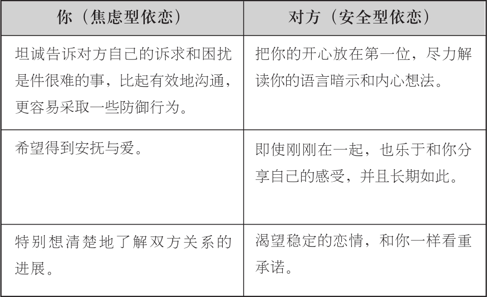 我们显然不会要求你竭尽全力去满足恋人的一切需求,也不会让你刻意控制打电话过去的时间。本书会从一个截然不同的角度,为你提供建议。首先你得明白,你与生俱来的焦虑型依恋风格,在恋爱中有着明确的需求。如果这些需求得不到满足,你是不会感到真正快乐的。为了找到这样一个满足你所有需求的伴侣,你的第一要务就是充分了解恋爱中的需求,包括亲密感、存在感以及安全感。与此同时,你也要相信这些需求都是非常合理的。它们并没有好坏之分,仅仅是你的需要而已。别让他人左右你的感情,误认为自己的渴望和依恋都是有罪的。在单身的时候,别为这种所谓的“不完整”而自卑,同样地,也不要因为对伴侣的依恋和渴望而羞愧。
