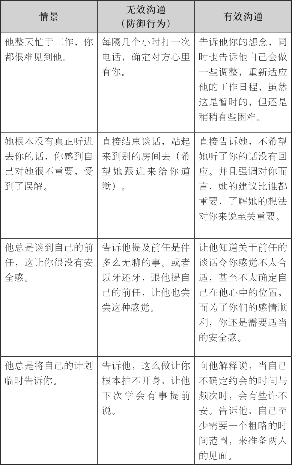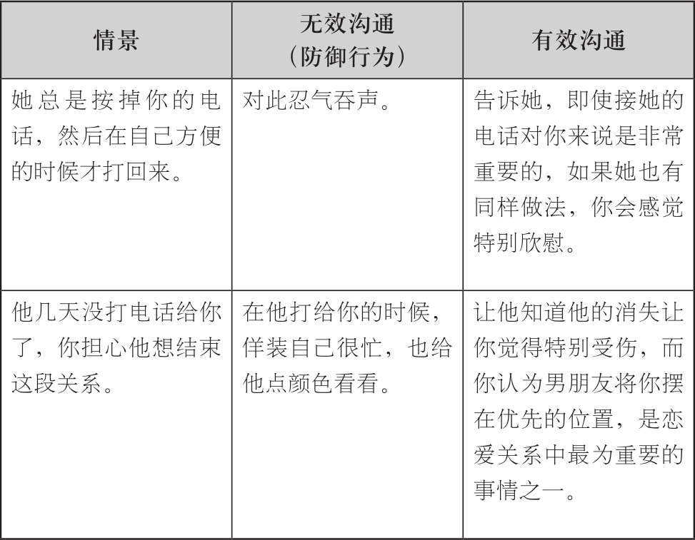 多看一下后面的例子,它们是在特定情况下,有着特定意义的有效沟通方法,注意体会有效沟通与无效沟通的不同之处。你就能明白,为什么伴侣在两种沟通方式之下的反应,有如此显著的差别了。