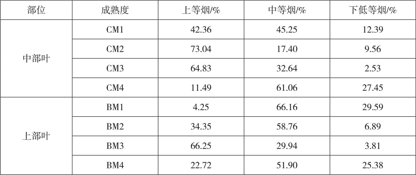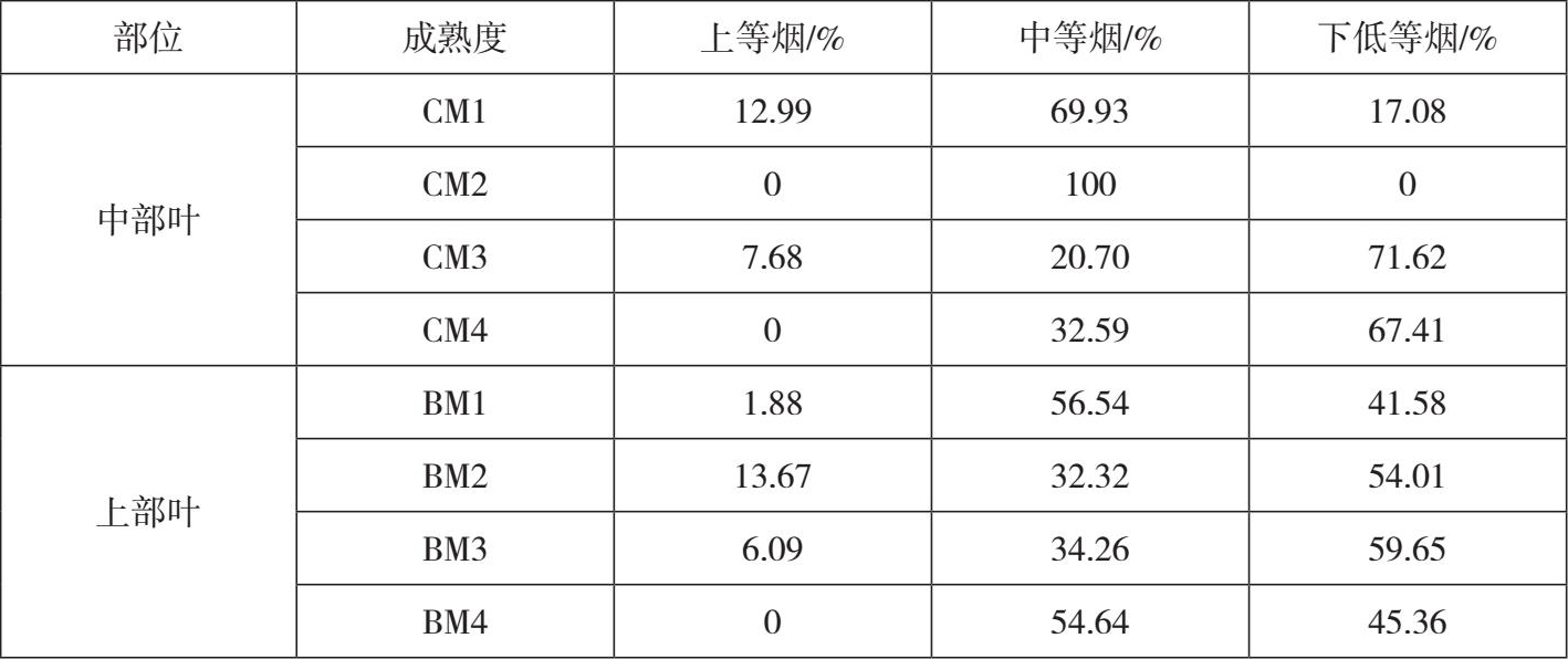 表2-4-2 红大不同成熟度烤后烟叶等级结构