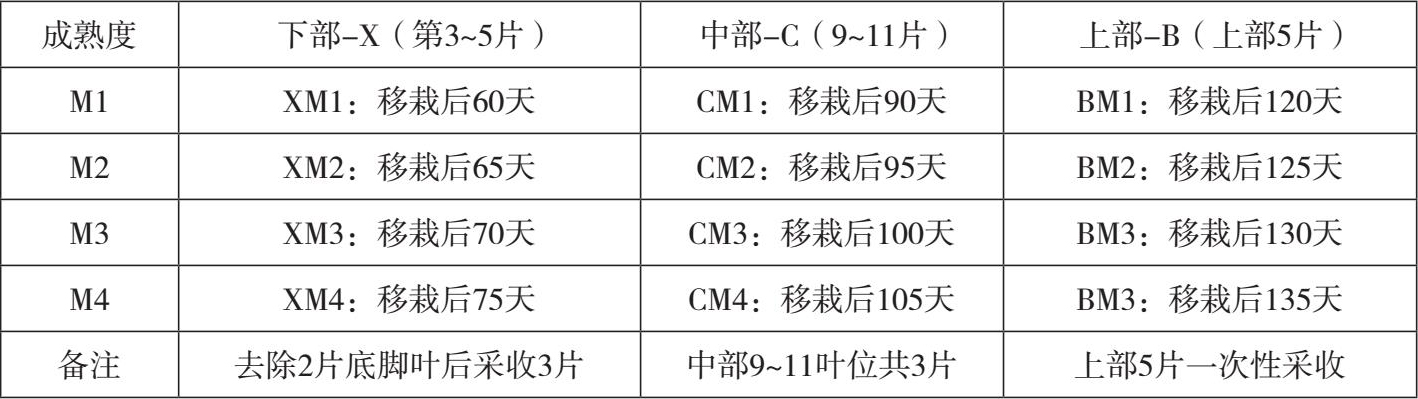 通过研究不同品种不同部位烟叶成熟度与烤后烟叶质量的相互关系,结合烤后烟叶内、外观质量评价,确定不同品种烟叶田间适宜成熟度的采收标准。