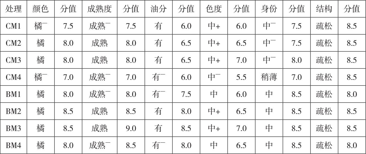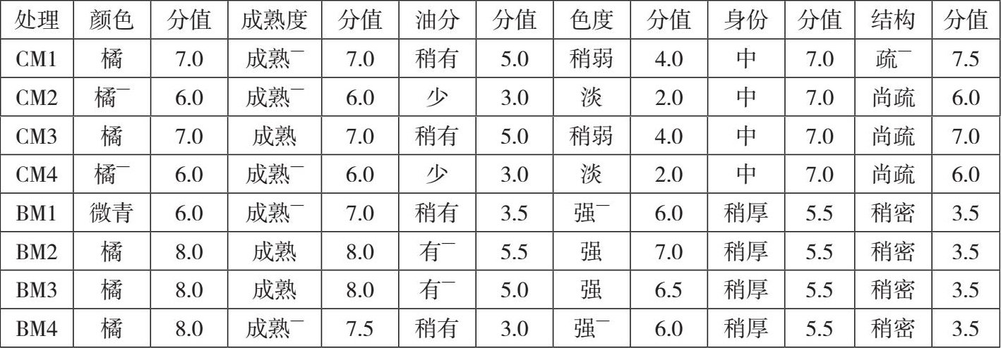 从表2-4-4可以看出,红大中部叶以CM3烤后烟叶外观质量最好,表现为颜色橘黄,成熟度较好,油分较足,色度中等偏上,结构疏松。CM2烤后烟叶除在身份指标方面得分略低于CM3外,其余指标与CM3无差异。上部叶成熟度、油分、色度随成熟度提高表现出先升高后下降的趋势,以BM3烤后烟叶外观质量最好。