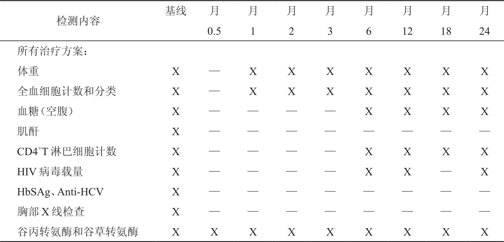 任何的抗反转录病毒药物都有可能导致肝毒性,特别是非核苷类药物。严重的肝毒性常与奈韦拉平(NVP)有关,可有血清转氨酶升高、黄疸及其他肝炎的临床表现(表3-4)。开始抗病毒治疗前,应评价患者先前已存在的肝脏疾病,包括患者HBV和HCV的感染状况及谷丙转氨酶(ALT)和谷草转氨酶(AST)的基线水平。若治疗前患者的ALT和AST值正常且HBV和HCV阴性,在接受含有奈韦拉平(NVP)的抗病毒治疗方案后,ALT或AST值升高>200U/L,应停用抗病毒治疗药物。当谷丙转氨酶(ALT)恢复正常并且症状消失后,患者可以在HIV临床专家指导下,重新开始采用含依非韦伦(EFV)的抗病毒治疗方案。在治疗最初的1~3个月内,应该每2周1次或更频繁监测ALT/AST,包括肝病症状的发生。