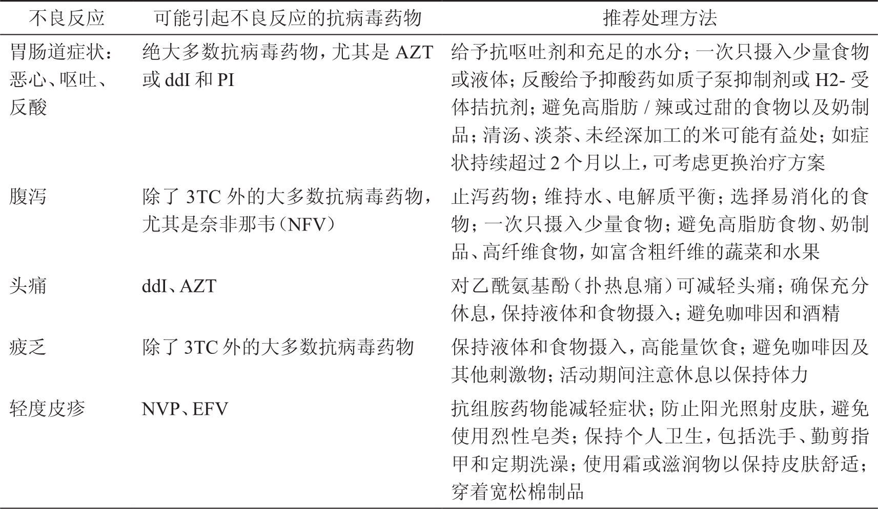 几乎所有的抗反转录病毒药物均可引起或轻或重的不良反应。这些药物不良反应若处理不当,一方面会给患者带来不适甚至严重的后果,另一方面也会影响患者的服药依从性,进而可能导致治疗失败。在启动抗病毒治疗前,医生必须仔细评估患者的基本情况、合并用药及其他合并症(如贫血、心血管疾病、肾功能不全等)、既往药物不良反应史等个体情况,结合不同抗病毒药物的特点,选择适当的药物,并应尽可能详细向患者解释服药注意事项、可能出现的药物不良反应及其处理措施,使其了解可能出现的症状及其严重程度。并在治疗过程中密切随访,及时发现及处理药物不良反应。