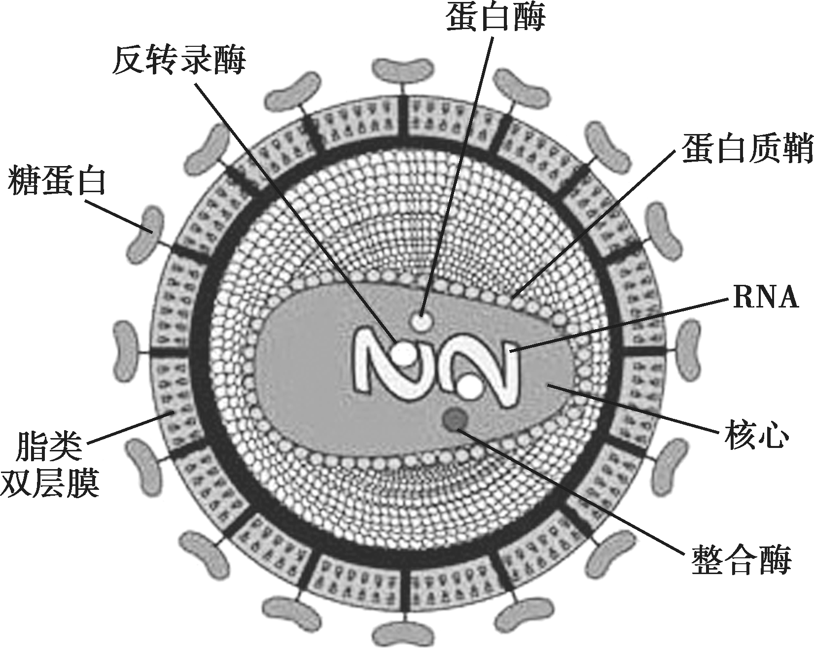 根据HIV基因差异,划分为HIV-1型和HIV-2型。大多数的艾滋病是由HIV-1型引起,HIV-2型主要在西非流行。HIV病毒大致呈球形,病毒直径约120nm,基本结构如图1-1所示。病毒外膜是脂类双层膜,来自宿主细胞,并嵌有病毒的糖蛋白gp120与gp41;gp41是跨膜蛋白,gp120位于表面,并与gp41通过非共价作用结合。向内是由蛋白p17形成的球形基质(matrix),以及蛋白p24形成的半锥形衣壳(capsid),即蛋白质鞘。衣壳内含有病毒的RNA基因组、酶(反转录酶、整合酶、蛋白酶)以及其他来自宿主细胞的成分。