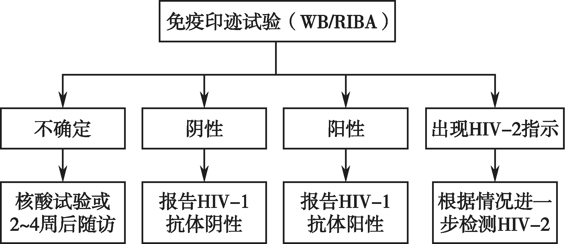 有HIV-1/2混合型和单一的HIV-1或HIV-2型。先用HIV-1/2混合型试剂进行检测,如果呈阴性反应,则报告HIV抗体阴性;如果HIV-1条带呈阳性反应,则报告HIV-1抗体阳性;如果不满足阳性标准,则判为HIV抗体检测结果不确定。如果出现HIV-2型的特异性指示条带,需用HIV-2型免疫印迹试剂再做HIV-2的抗体确证实验。呈阴性反应,报告HIV-2抗体阴性;呈阳性反应则报告HIV-2抗体血清学阳性(图1-4)。符合HIV抗体不确定判断标准,报告“HIV抗体不确定(±)”,在备注中应注明等待“4周后复检”。