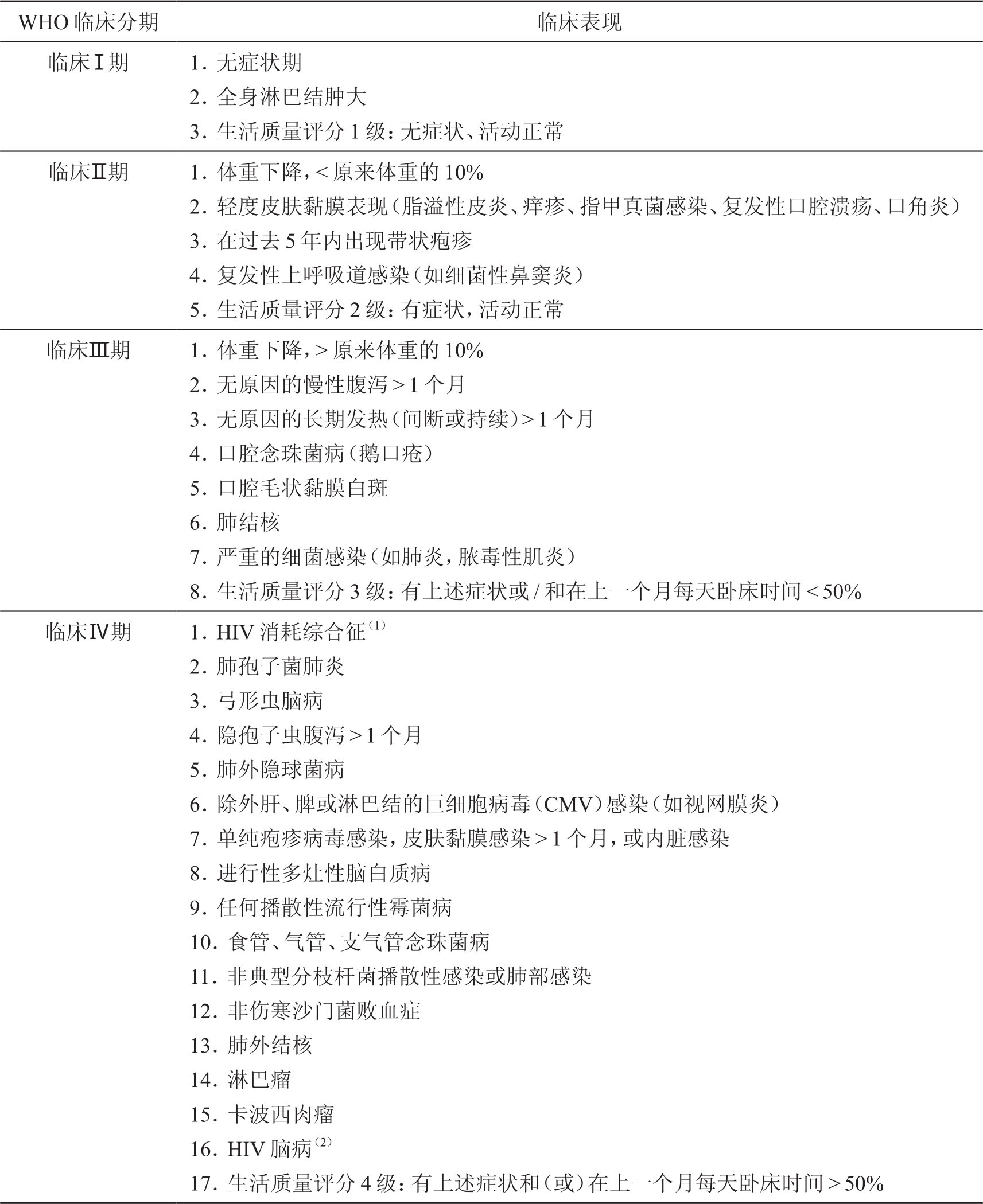 世界卫生组织(World Health Organization,WHO)将成人及青少年HIV感染分4个期,即临床Ⅰ期、临床Ⅱ期、临床Ⅲ期以及临床Ⅳ期,见表1-1。