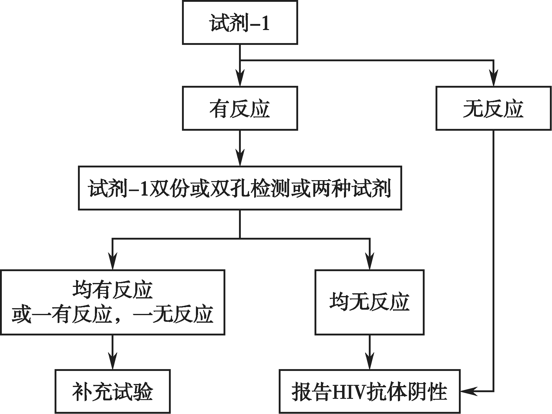 (1)酶联免疫吸附试验(enzyme-linked immunosorbent assay,ELISA)是目前最常用的HIV抗体筛查试验。用于HIV抗体检测的ELISA试剂的发展已经历了四代,前两代是间接法试剂,现已趋于淘汰。第三代ELISA试剂方法学为双抗原夹心法,所用抗原为高度纯化的基因重组抗原或人工合成多肽(包括O群抗原),可同时检测IgG、IgM抗体,已成为我国目前在临床和血液筛查中使用的主要方法。第四代试剂可同时测定HIV-1/2抗体和p24抗原,称HIV抗原/抗体试剂。ELISA法检测HIV抗体的敏感性和特异性都超过99%。其假阴性结果通常出现在HIV感染最初的1~2周内或是疾病后期抗体水平很低的时候;而假阳性结果则可能与以下疾病相关:自身免疫性疾病、肾衰、胆囊纤维化、肝病、血液透析、多次妊娠或输血以及接种疫苗等。这类试验可使用血液(包含血清、血浆和滤纸干血斑)、尿液样本进行检测。对在筛查试验中无反应的样本,可报告为HIV抗体阴性,对有反应的样本,用原有试剂和另外一种不同原理(或不同厂家)的筛查试剂进行复检,复检均无反应的样本报告HIV抗体阴性,复检均有反应或一种筛查有反应、另一种无反应的样本,开展补充试验。HIV抗体筛查试验流程如图1-3所示。
