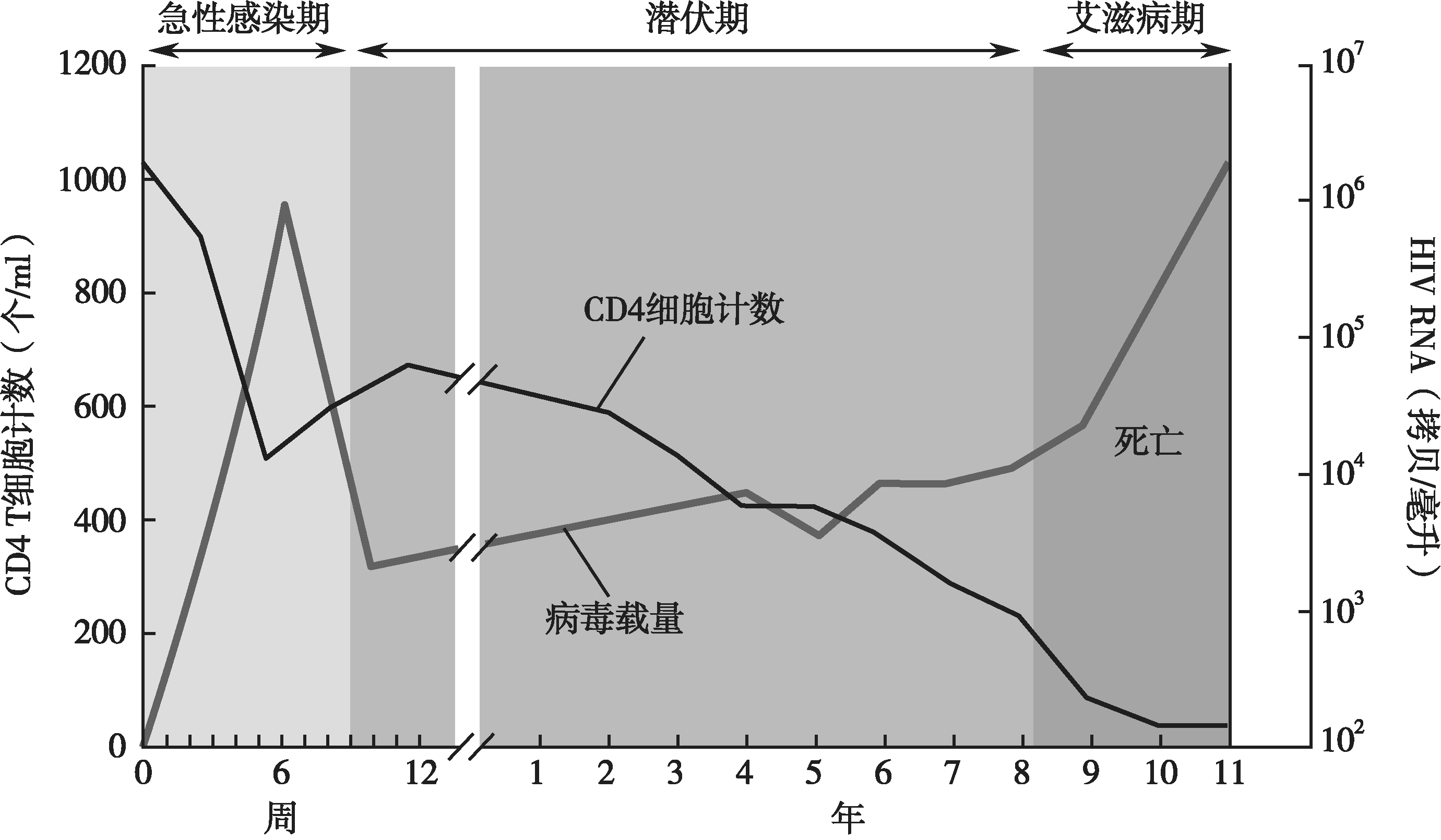 HIV进入人体后,24~48小时内到达局部淋巴结,5天左右在外周血中可以检测到病毒成分。继而产生病毒血症,导致以CD4 + T淋巴细胞数量短期内一过性迅速减少为特征的急性感染。大多数感染者未经特殊治疗,CD4 + T淋巴细胞可自行恢复至正常或接近正常水平。但病毒并未被消除,形成慢性感染。慢性感染包括无症状感染期和有症状感染期。无症状感染期时间可达数年不等。