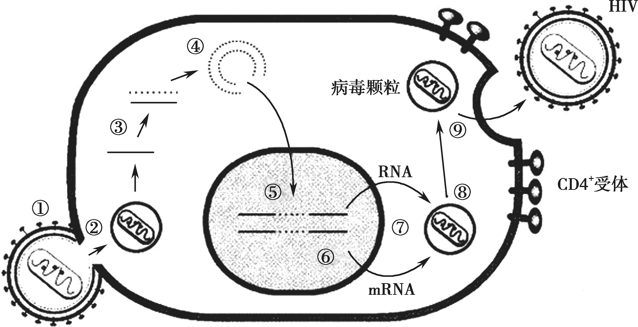 ①吸附;②脱衣壳;③反转录;④环化;⑤整合;⑥转录;⑦翻译;⑧核心颗粒组装;⑨HIV的组装和出芽
