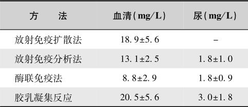 目前,α 1 -MG较为精确的测定方法是放射免疫扩散法、放射免疫分析及酶联免疫法。胶乳凝集反应(LFT)较为简单、快速、敏感性高,可作为仅α 1 -MG的一项筛选试验。其正常值见表5-4。