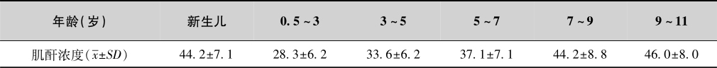 正常人肌酐的排泄主要通过肾小球滤过。原尿中的肌酐不被肾小管重吸收。当静脉注射肌酐使血肌酐浓度异常增高时,肾小管也能排泌相当量的肌酐。血清肌酐水平主要取决于肌肉中肌酐的含量,受饮食影响较少,昼夜尿中排泄量常保持在一定范围内。正常小儿血清肌酐浓度随年龄不同而异,出生后血清肌酐值高。6个月~2岁为低值,2~11岁则随身高按比例增加,详见表5-7。