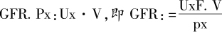 单位时间内从双肾滤过的血浆的毫升数即肾小球滤过率(glomerular filtration rate,GFR)。它是测定肾小球滤过功能的重要指标。假设:x:存在于血中并能从肾小球滤过的物质;Px:代表x在血浆中的浓度;Ux:代表x在尿中的浓度;V:每分钟尿量;E:每分钟从肾小管中排泌的x的物质的量;R:每分钟由肾小管重吸收的x物质的量。