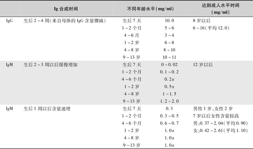 不同测定方法及不同年龄的小儿血清免疫球蛋白(immunoglobulin)的含量不一,见表5-12。