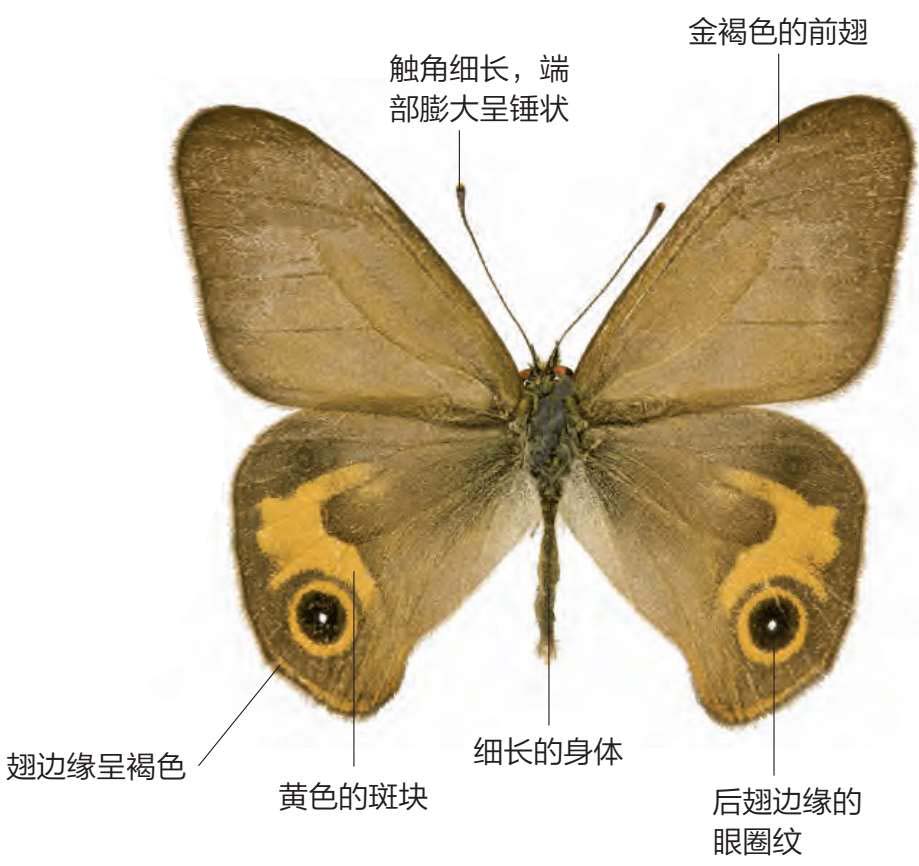 橙色蛇目蝶触角细长,端部膨大呈锤状,身体较长。其前翅和后翅均为金褐色,前翅的边缘呈褐色,前翅反面和正面的图案相似,颜色稍淡。后翅边缘有一个眼圈纹,且有淡灰褐色的外圈,眼纹上方有一块不规则的黄色斑块。