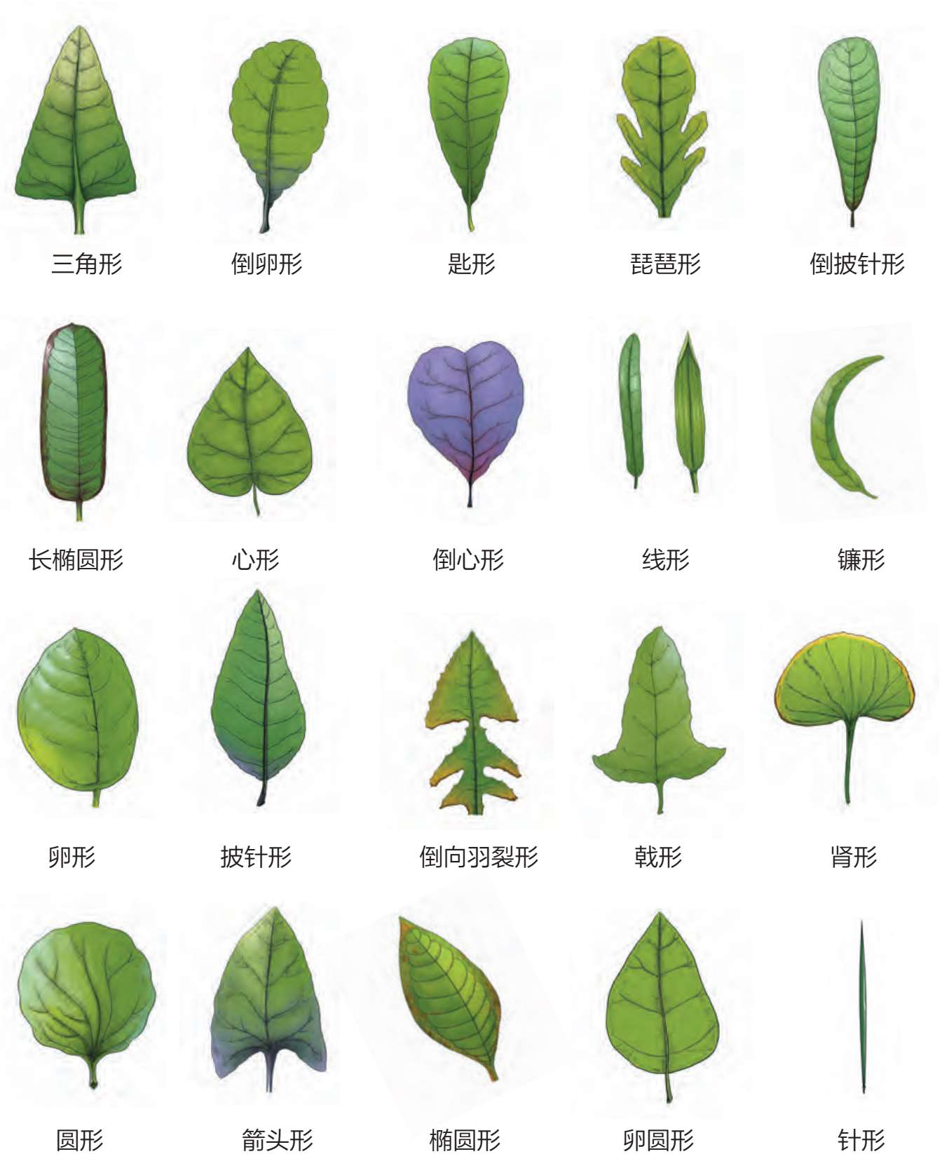 叶序、叶片大小和形状等都是鉴别药用植物的关键,特别是当一种药用植物花的特征不明显的时候,叶的特征显得尤为重要。药用植物叶子的形状大致有三角形、倒卵形、匙形、琵琶形、倒披针形、长椭圆形、心形、倒心形、线形、镰形、卵形、披针形、倒向羽裂形、戟形、肾形、圆形、椭圆形、卵圆形、针形等多种,如下图所示: