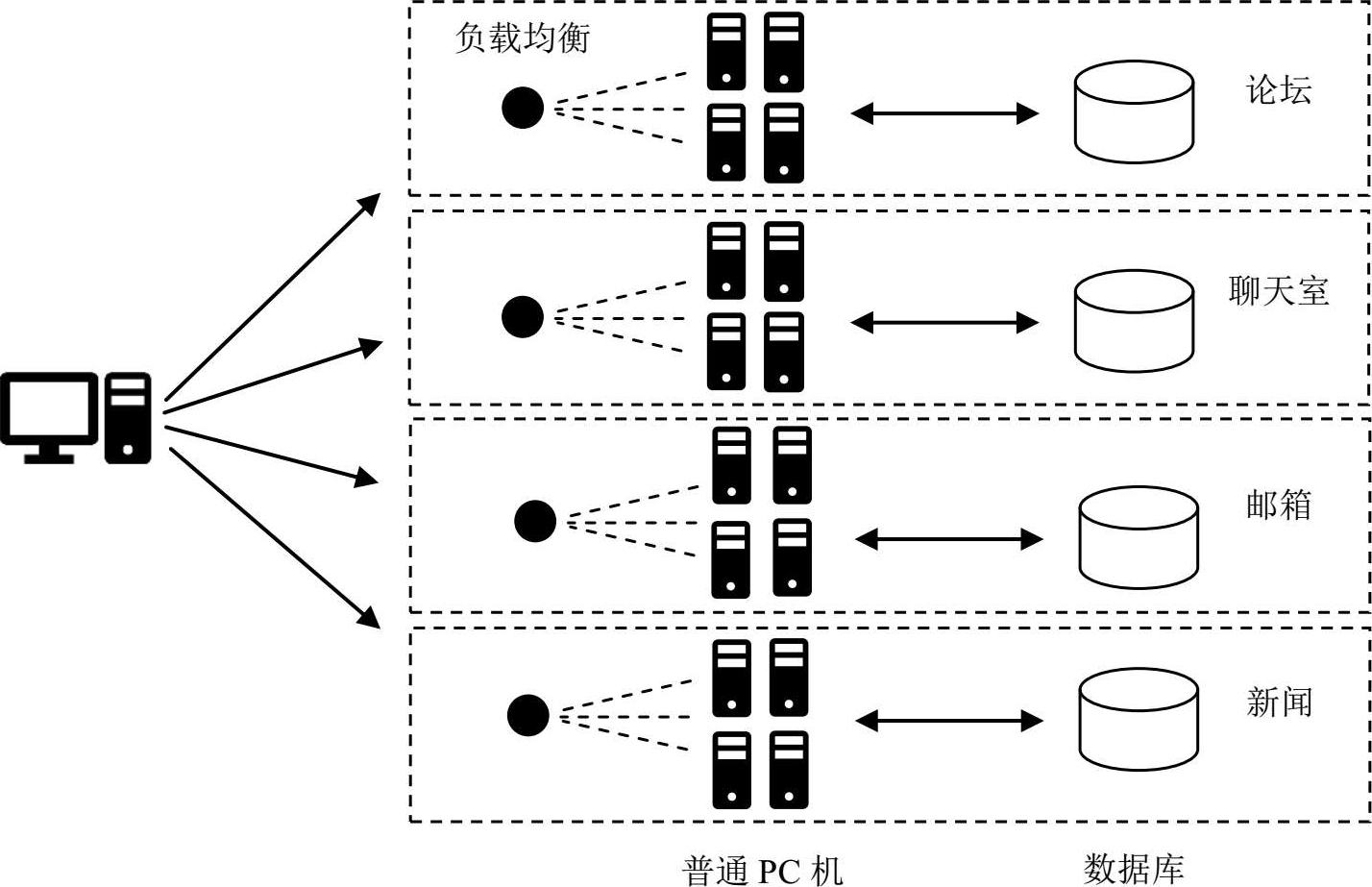 回到之前谈论的集群部署架构,通过普通PC的堆砌,工程师们成功将架构进化成了如图1.4所示的样子。