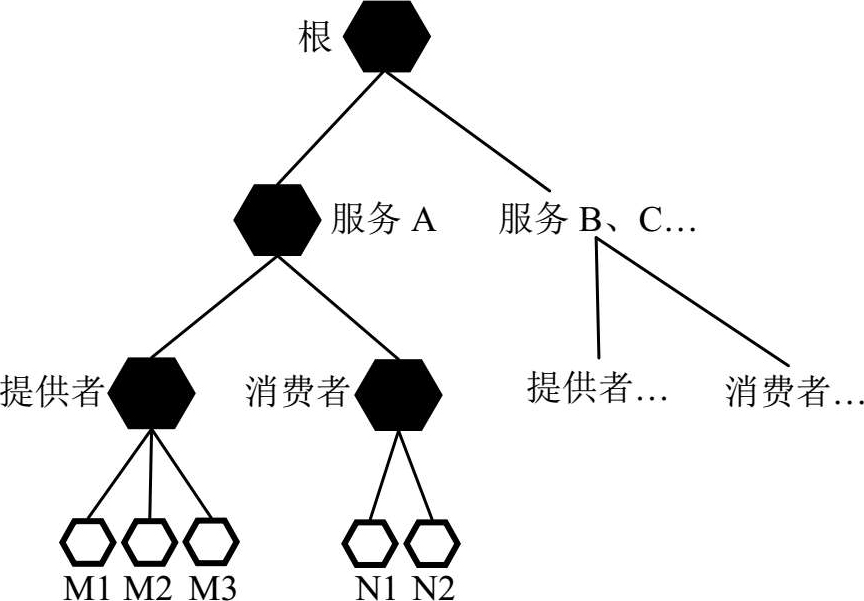 Dubbo的“服务治理”采用的是ZooKeeper,由于其自身数据结构的设计,其服务关系存储采用的是树状结构,如图1.7所示: