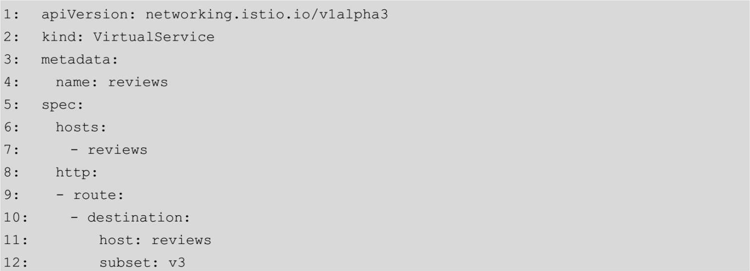 在上面的各类配置中,Istio 中使用得较多的主要是 CDS 与 RDS,其作用是对服务及路由信息进行配置,例如之前 BookInfo 示例项目中,要将 reivews 的流量都分配到 v3 版本中,则需配置如下规则: