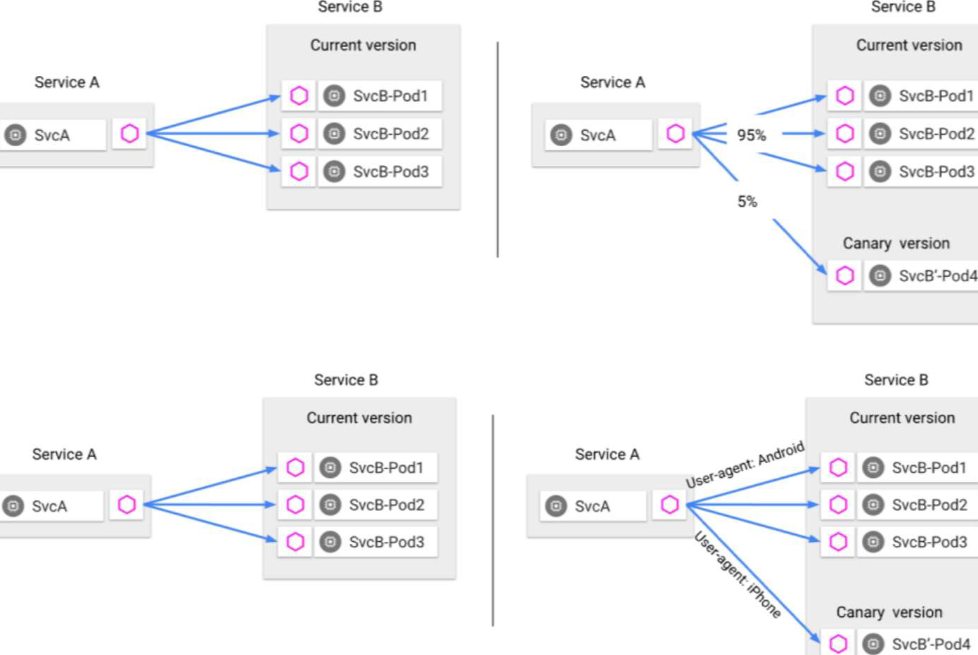 使用 Istio 的核心优势在于完全将业务逻辑、分布式调用以及基础组件设施解耦。运维人员只需要简单地向 Pilot 中发送一些配置,就可以轻松掌控全局。在正常情况下,Envoy 会对下游流量做负载均衡,这里主要有“轮询(Round Robin)”与“最少连接(Least Connection)”两种。除此之外还可以做特殊的定制,例如可以向指定的下游分配 5% 的流量;或为链路添加链路跟踪功能;抑或针对某个版本做特定的转发规则。