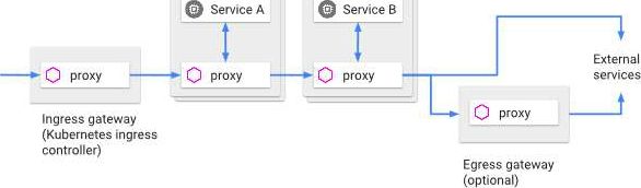 Istio 提倡所有进入与离开服务网格的流量都经过一个特殊的网关(见图2.6),这样才能比较轻松地管理内部的网格,在安全、单元封闭、接口扩展层面上都有好处。