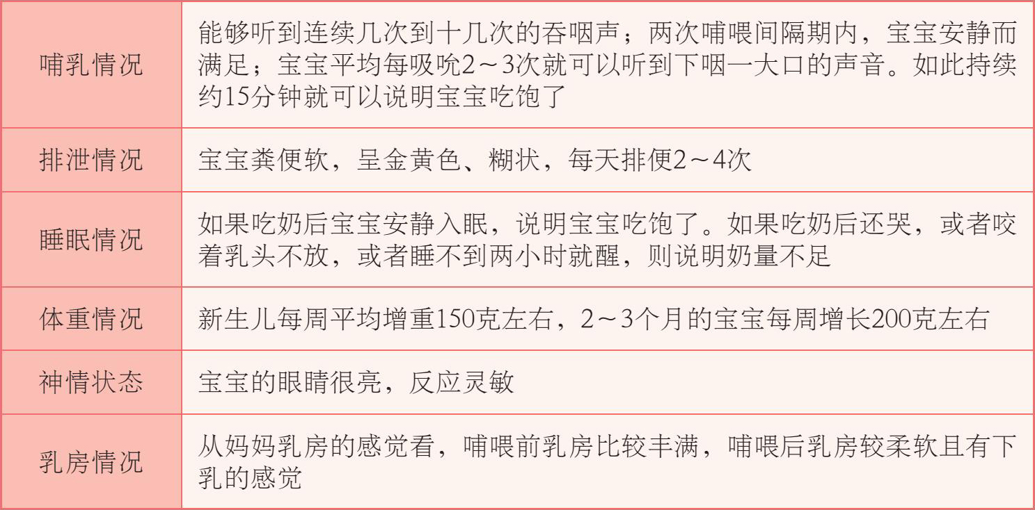 饥饿的宝宝首先会变得急躁,活动增多,拱嘴或是扮怪脸,哭泣是饥饿晚期的表现。其实大多数妈妈的母乳都能满足宝宝的需要。如果你还是担心宝宝吃不饱,下面几个标准可以让你了解你的母乳是否已经足够宝宝食用: