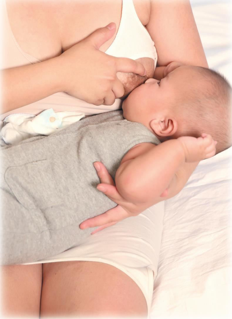 妈妈躺在床上采取侧卧或仰卧姿势,与新生儿面对面,宝宝可侧卧或俯卧吃奶。