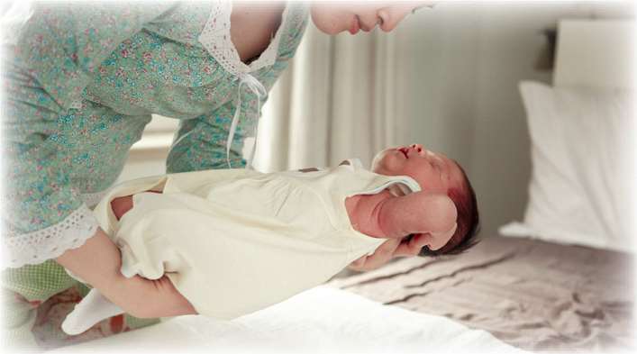 将左手插到宝宝的脖子下面,轻轻地托起宝宝的头部。右手插到宝宝的屁股下面。左手先用力托起宝宝的头部,然后右手也跟着用力,就把宝宝从床上抱起来了。尽量让宝宝的身体靠近自己的身体。