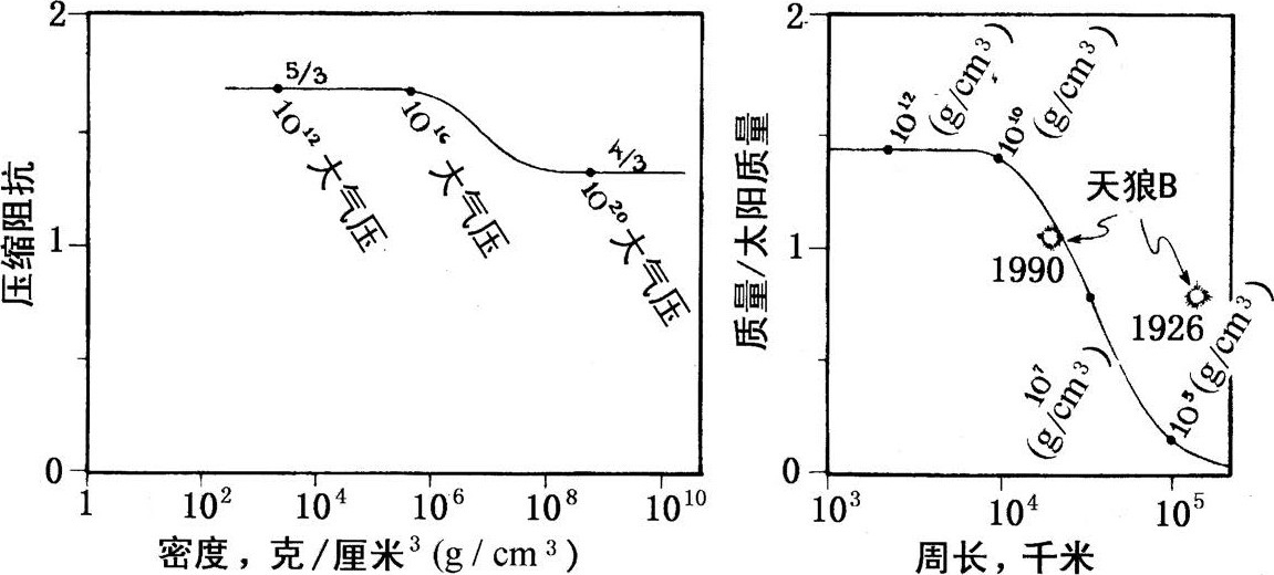 斯托纳—安德森状态方程表明,当白矮星物质的密度被挤压得越来越高,从非相对论的低密度和低电子速度区域进入相对论的高密度和近光速的高电子速度区域,物质的压缩阻抗光滑地从5/3降到4/3(图4.3左)。阻抗的变化不会比这更简单了。